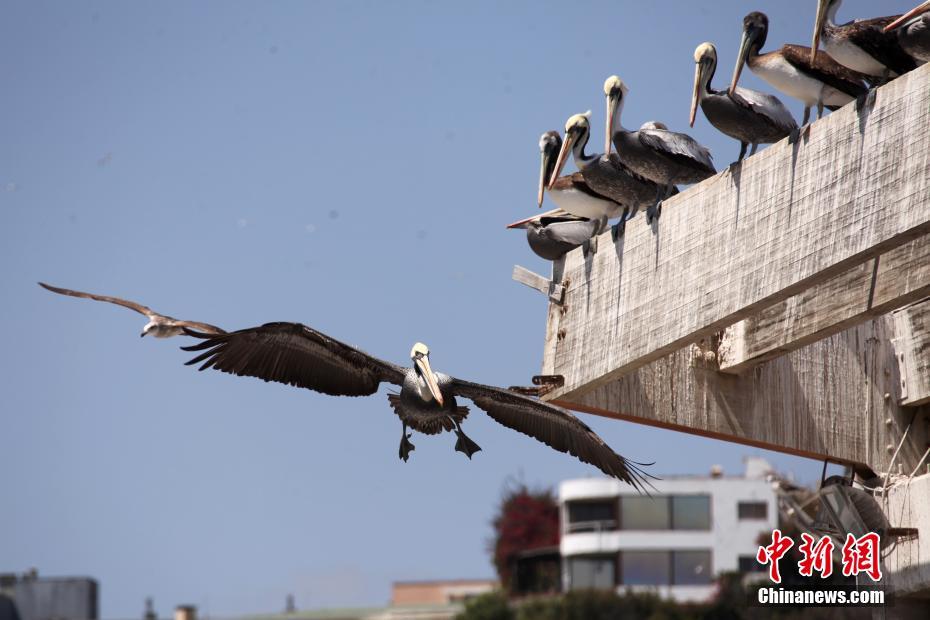 11月3日,智利海滨城市瓦尔帕莱索的沙滩边,不少鹈鹕在这里集结休闲,成为了南太平洋海岸边的一道风景。中新社记者 余瑞冬 摄