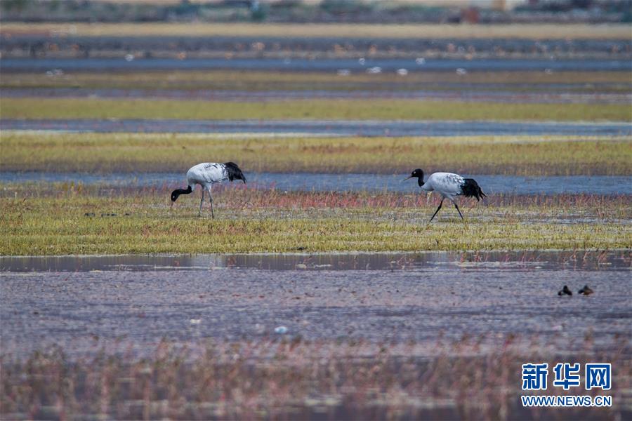 黑颈鹤在纳帕海自然保护区栖息(11月10日摄)。 初冬时节,位于云南省西北部的迪庆藏族自治州境内的梅里雪山、普达措、纳帕海、白水台等景色迷人。 新华社记者 胡超 摄
