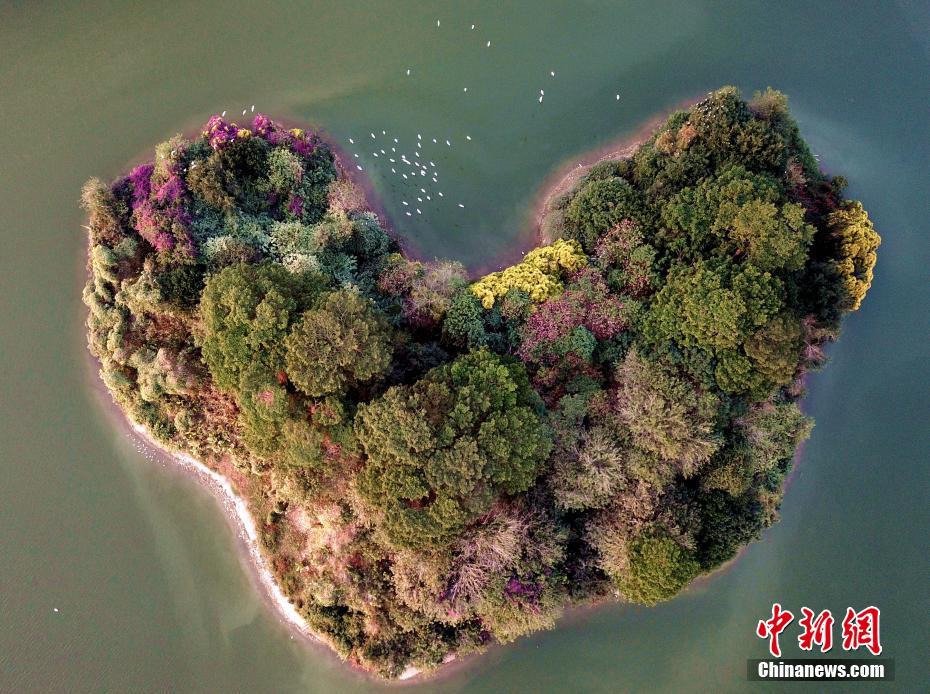 11月13日,空中鸟瞰位于福建漳州碧湖的“心岛”,岛周白鹭纷飞。近年,随着生态环境的不断好转,碧湖已成为漳州的一张名片,吸引许多市民在此休闲娱乐。(航拍图片)中新社记者 王东明 摄