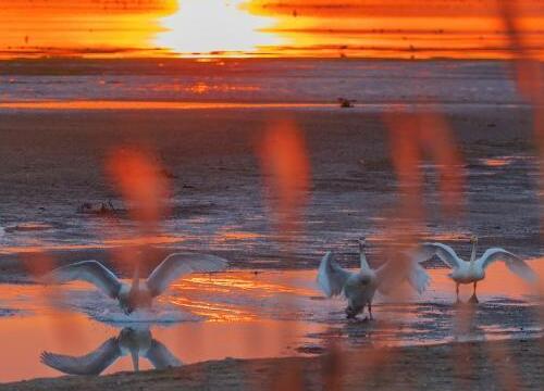 摄影师山东荣成天鹅湖畔拍到“天鹅舞朝晖”美景