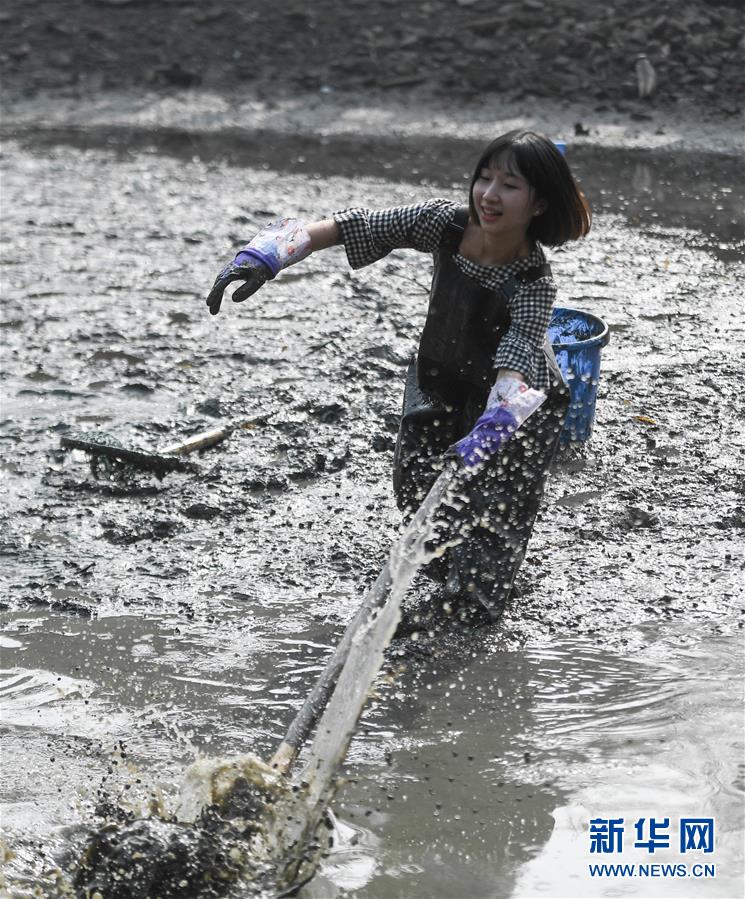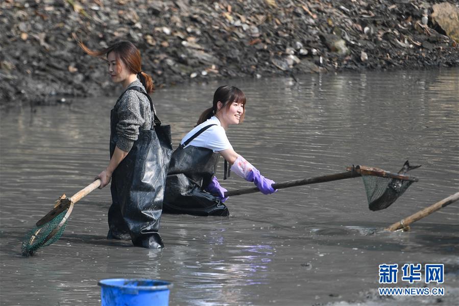 11月24日,游客在西溪湿地体验“干塘”捕鱼。 近日在杭州西溪国家湿地公园,渔夫们抽掉塘水清理淤泥,一批游客借用渔夫们的下水裤,体验“干塘”捕鱼。 “干塘”是杭州西溪一带村民的传统生产习俗,渔户在冬季将鱼塘内的水抽掉,清挖淤泥,以便第二年可以更好地养鱼。 新华社记者 黄宗治 摄