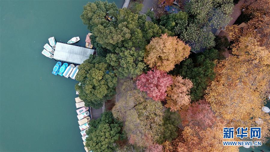 12月10日,游船停靠在湖南烈士公园年嘉湖湖畔(无人机拍摄)。新华社记者 陈泽国 摄