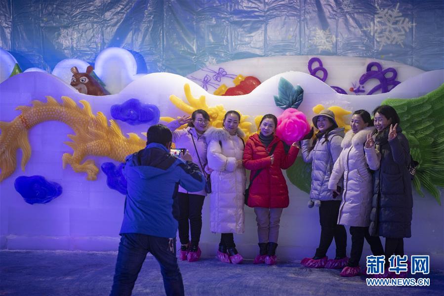 12月25日,游客在冰雕前合影。 当日,山西吉县人祖山首届冰雪节以冰雕、雪雕以及多种冰雪游乐项目吸引了众多游客前来参观体验。本次冰雪节活动将持续至2020年2月10日。 新华社记者 杨晨光 摄