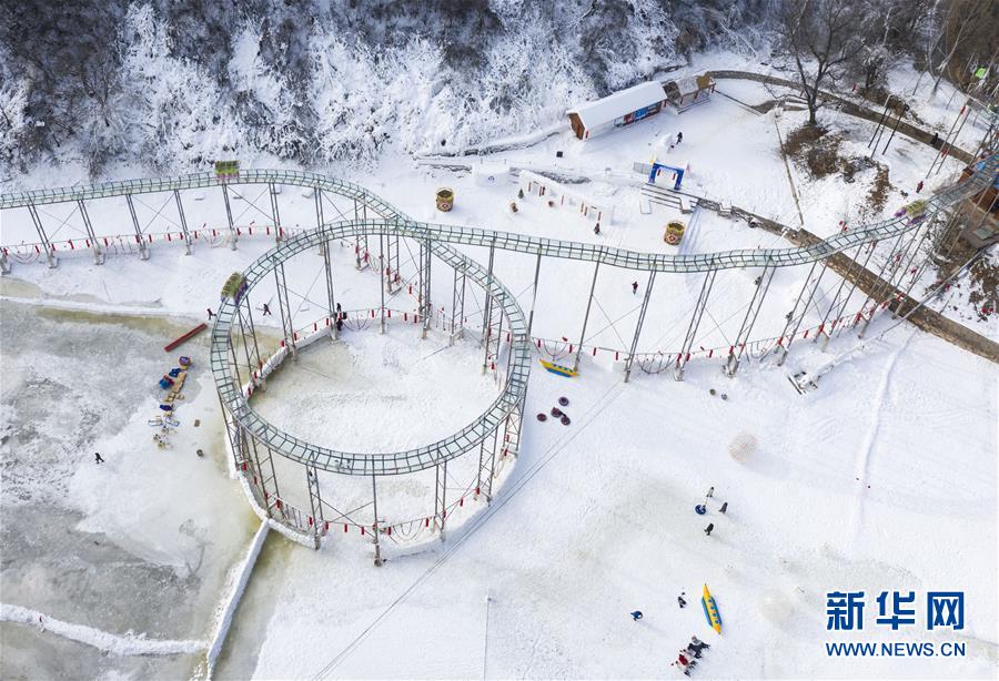 这是12月25日无人机拍摄的山西吉县人祖山首届冰雪节活动现场。 当日,山西吉县人祖山首届冰雪节以冰雕、雪雕以及多种冰雪游乐项目吸引了众多游客前来参观体验。本次冰雪节活动将持续至2020年2月10日。 新华社记者 杨晨光 摄