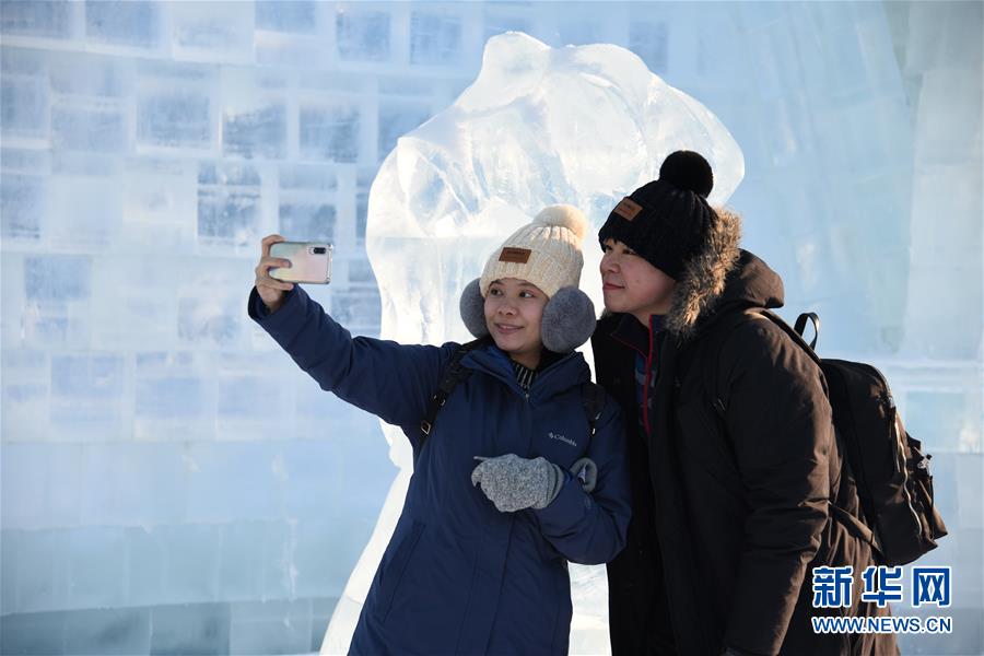 2019年12月31日,人们在哈尔滨冰雪大世界中自拍。 当日,在北国冰城哈尔滨,许多市民游客不畏严寒,在冰天雪地中尽情游玩,迎接新年到来。 新华社记者 李建平 摄