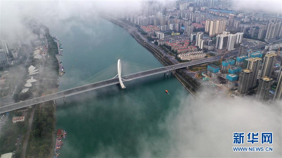 1月14日,一场冬雨过后,广西柳州柳江两岸云雾升腾,如梦似幻,宛如画卷(无人机照片)。新华社发(黎寒池 摄)