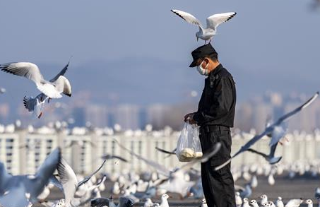 长城站贼鸥湖里戏水的贼鸥(2月10日摄)。