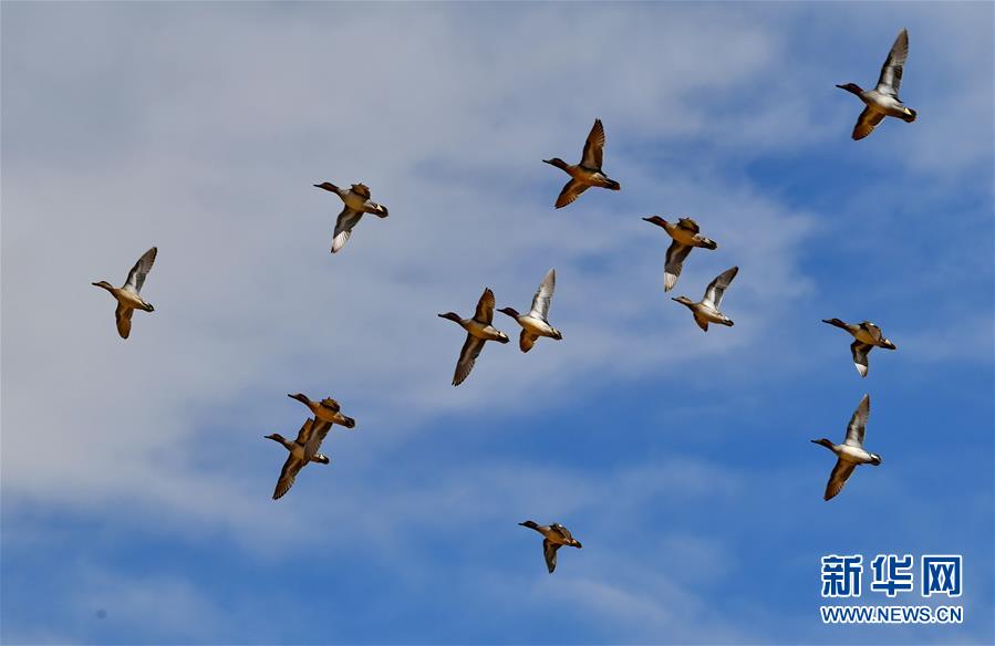 一群野鸭在拉鲁湿地上空飞翔(2月24日摄)。 初春的拉萨,气温回升,拉鲁湿地国家级自然保护区冰雪消融、百鸟飞舞。位于拉萨市西北的拉鲁湿地国家级自然保护区海拔3645米,湿地保护面积近13平方公里,被誉为“拉萨之肺”。 新华社记者 张汝锋 摄
