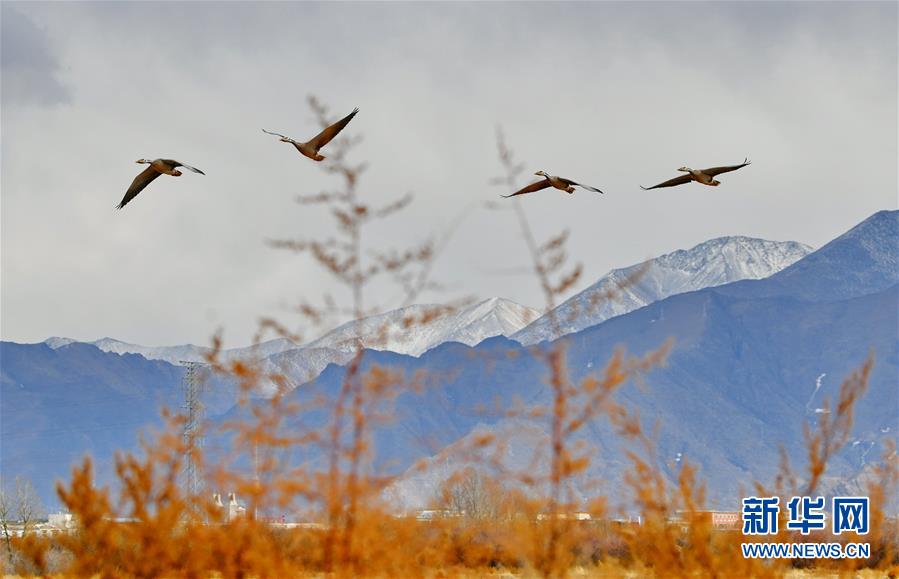 斑头雁在拉鲁湿地上空飞翔(2月24日摄)。 初春的拉萨,气温回升,拉鲁湿地国家级自然保护区冰雪消融、百鸟飞舞。位于拉萨市西北的拉鲁湿地国家级自然保护区海拔3645米,湿地保护面积近13平方公里,被誉为“拉萨之肺”。 新华社记者 张汝锋 摄