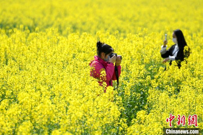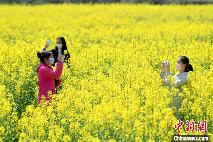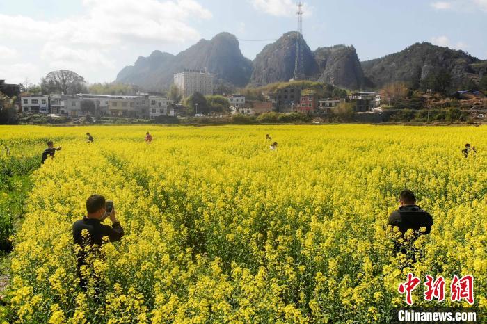 3月1日,湖南平江石牛寨万亩油菜花盛开,丹霞地貌中金黄色的花海吸引了游人踏青前来,拍照赏花。 杨华峰 摄