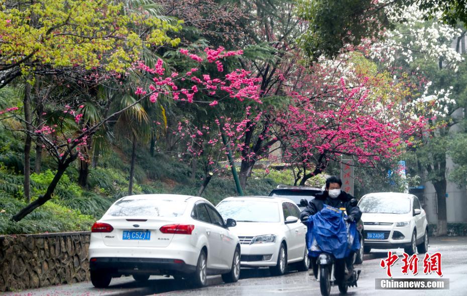 3月3日,武汉下着沥沥小雨,在武汉大学校医院旁的珞珈山畔,数棵早樱迎春绽放。 中新社记者 张畅 摄