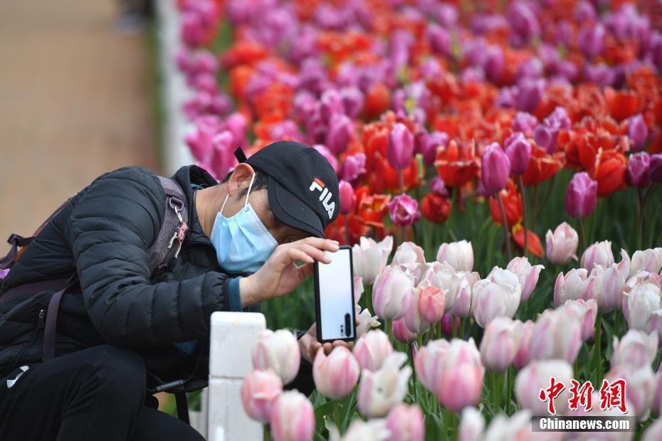 3月4日,戴口罩的游客在公园内拍摄郁金香。昆明市捞鱼河湿地公园日前恢复开放,园内盛开的郁金香吸引市民游客前来赏花。中新社记者 刘冉阳 摄