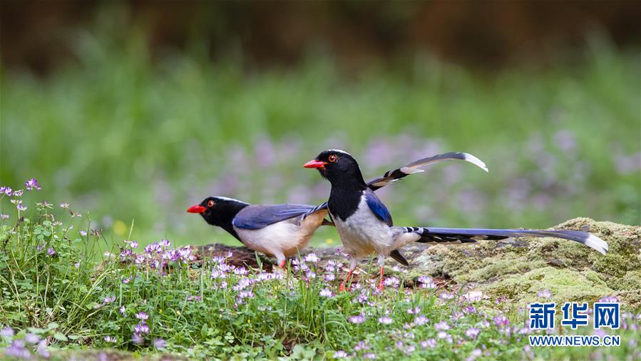 3月22日,在福建省明溪县夏坊乡中溪村,红嘴蓝鹊在紫云英花海里嬉戏。 新华社记者 梅永存 摄