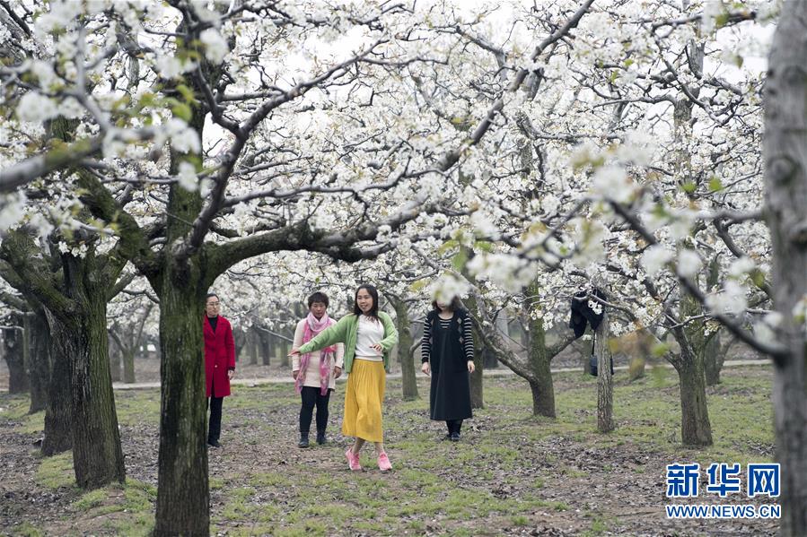 3月26日,游客在河南省商丘市宁陵县万亩生态梨园内观光游览。