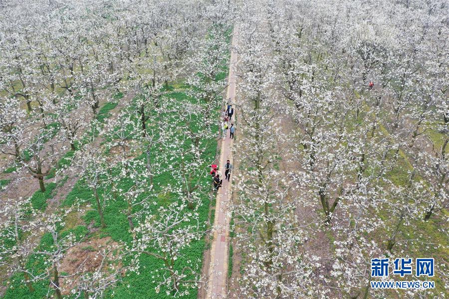 这是3月26日拍摄的河南省商丘市宁陵县万亩生态梨园(无人机照片)。新华社记者冯大鹏摄