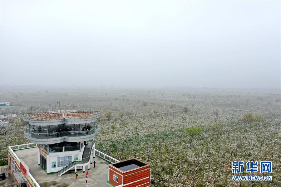 3月26日,游客在河南省商丘市宁陵县万亩生态梨园内观光游览(无人机照片)。新华社记者冯大鹏摄