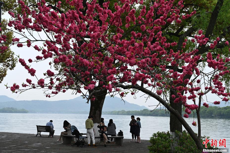 春季的末月,疫情日渐趋稳,在春季的最后一个月,西湖正在“全力以赴”展示她的美,吸引游客及市民前往观赏。图为多位市民及游客在西湖边游玩。 张茵 摄