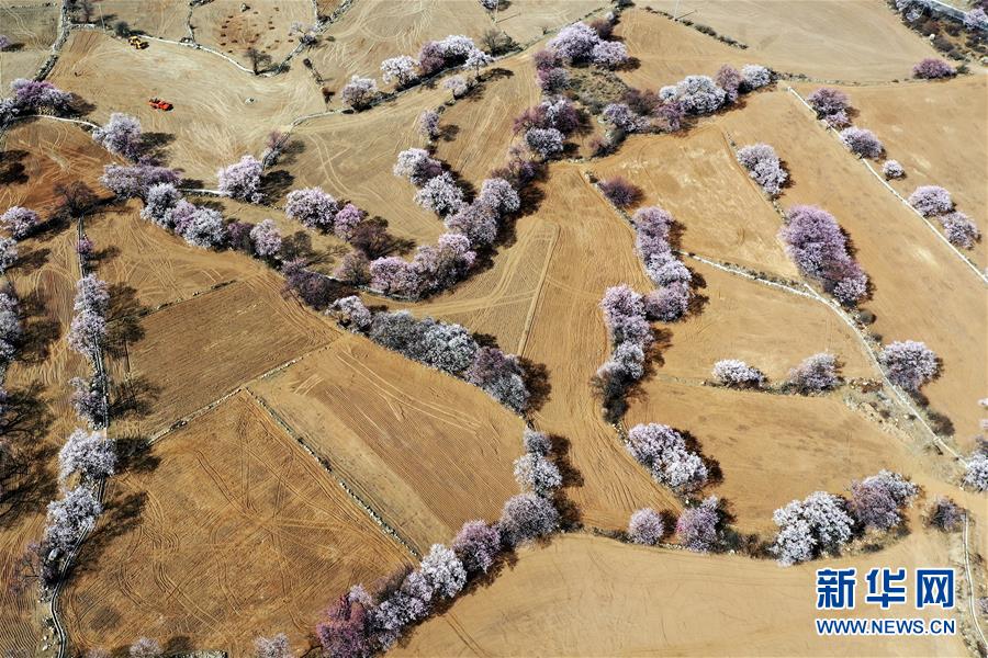 西藏林芝市波密县境内桃花盛开的田园风光(无人机照片,3月26日摄)。新华社记者 詹彦 摄
