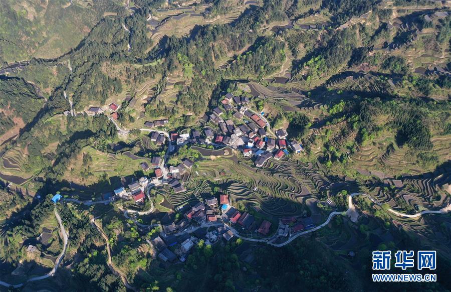 这是融水苗族自治县杆洞乡小河村高羽苗寨的木楼和梯田(3月31日摄,无人机照片)。 随着气温逐渐转暖,广西融水苗族自治县杆洞乡的苗寨梯田景色迷人,美如画卷。 新华社记者 黄孝邦 摄