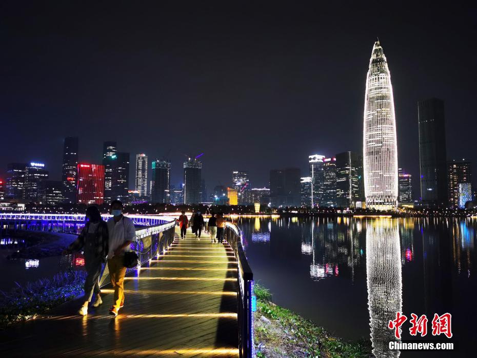 4月14日晚,夜色下的广东深圳地标建筑“春笋”灯光璀璨。中新社记者 陈文 摄