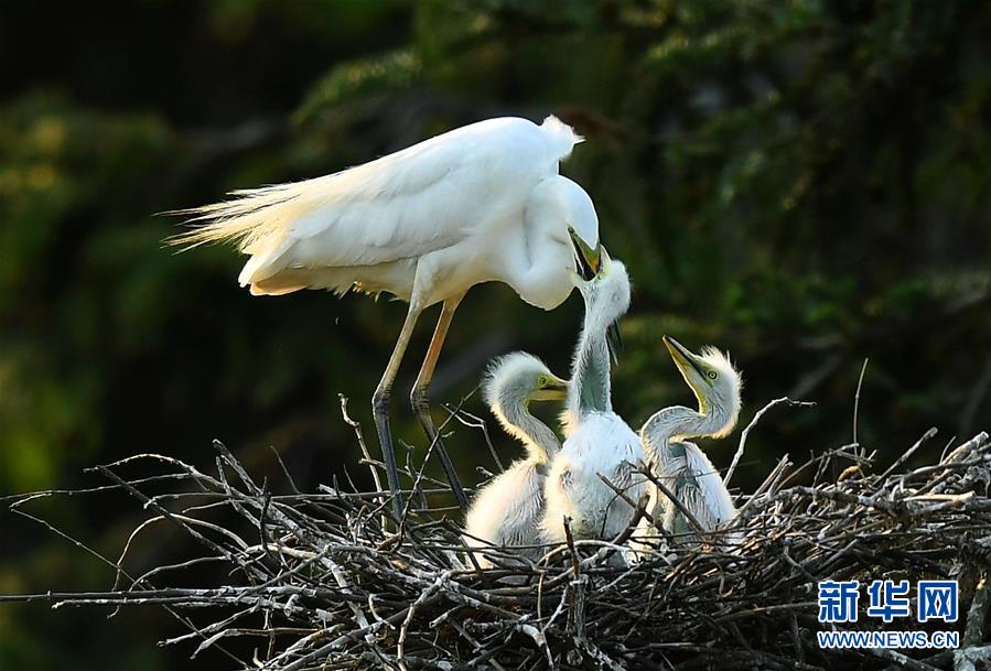 在南昌市新建区象山森林公园内,一只白鹭在鸟巢内给幼鸟喂食(4月27日摄)。 近日,在江西省南昌市新建区象山森林公园内,已安家筑巢的大批白鹭进入繁殖旺季。在夕阳的照耀下,白鹭时而翩翩起舞,时而展翅盘旋,构成一幅美丽的自然生态画卷。 新华社记者 万象 摄