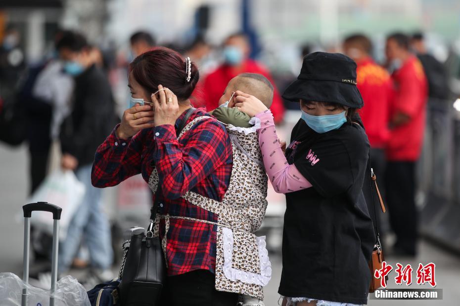 贵阳北站,旅客在进站前整理口罩。中新社记者 瞿宏伦 摄