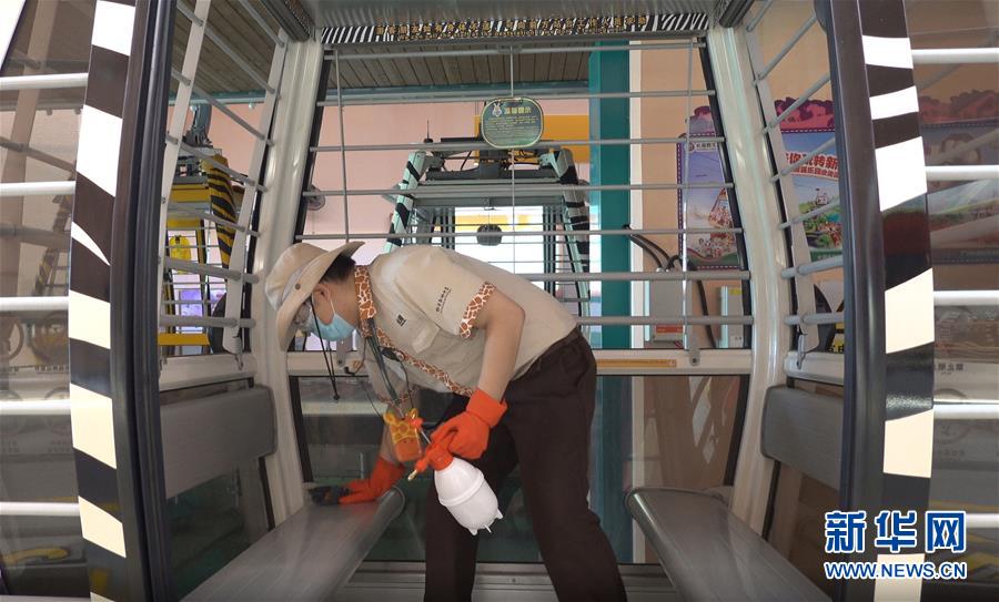 5月5日,广州长隆野生动物世界工作人员在开园前对缆车消毒。“五一”小长假期间,广州长隆野生动物世界实施线上预约、健康登记、实名入园、体温监测等多项措施,加强景区管理,引导游客安全有序旅游。 新华社记者 卢烨 摄