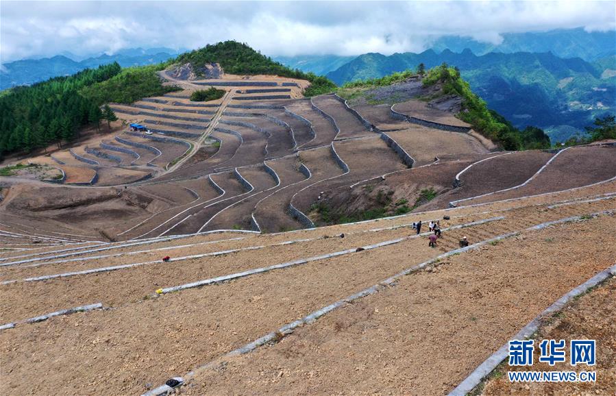 5月6日,在湖北省宣恩县长潭河侗族乡龙马山村,一处岩石遍布的土地经整理后变成梯田,农民们在田间种植药材(无人机照片)。 地处湖北省西部山区的恩施土家族苗族自治州宣恩县属喀斯特地貌山区,人均耕地面积少。近年来,当地通过实施土地整理、低丘岗地改造、小流域治理等,在田间建设耕作道、步行道、供排水设施等,部分田地在改造过程中还置入乡村旅游元素,成为农业风景区、产业观光园等,为当地土家族、苗族等少数民族群众打赢脱贫攻坚战提供可持续内生动力。 新华社发(宋文 摄)
