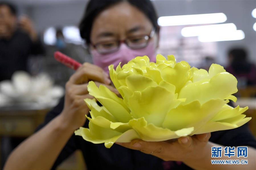 艺术工作者在洛阳李学武牡丹瓷园制作牡丹瓷(4月26日摄)。新华社记者 朱祥 摄