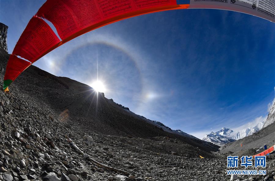 10时2分,珠峰地区上空出现日晕景观(5月1日摄)。新华社记者 晋美多吉 摄