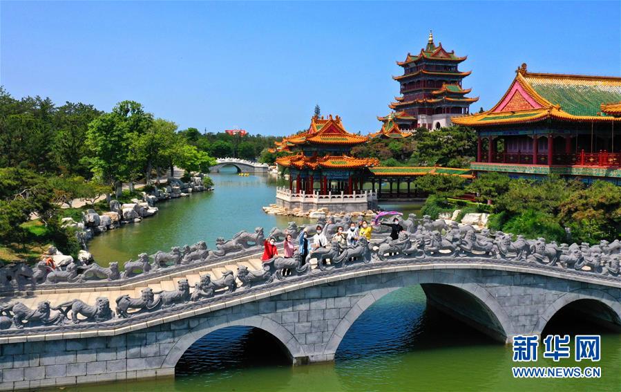 5月19日,游客在山东蓬莱市三仙山观光游览(无人机照片)。 当日是中国旅游日。 新华社发(于良意 摄)