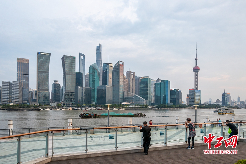 2020年6月2日,上海,当天黄昏时分,不少市民在北外滩国航段最佳摄影点拍摄陆家嘴风光。市民使用手机或相机在栏杆上安装的不锈钢反光镜面上,可以轻松拍出陆家嘴实景和倒影同框的“天空之镜”风光大片。王冈/视觉中国