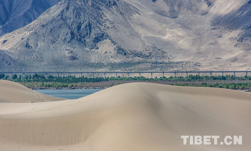 图为近处的沙丘与远处在建的川藏铁路拉林段 摄影:赵耀