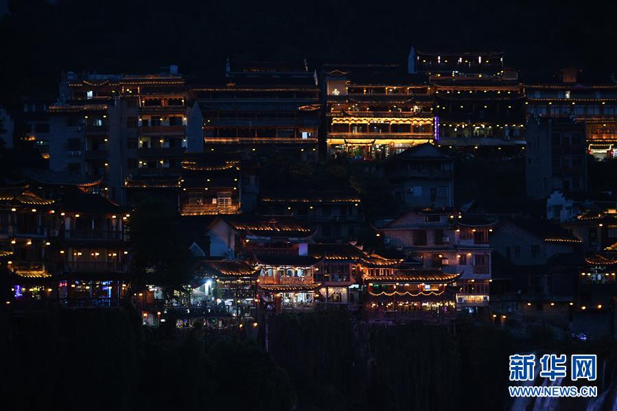 这是6月11日拍摄的湘西土家族苗族自治州永顺县芙蓉镇景区内的吊脚楼。 近日,湘西土家族苗族自治州永顺县芙蓉镇景区在做好疫情防控的情况下恢复开放。夜幕降临,景区内的瀑布、吊脚楼与灯光交相辉映,美不胜收,吸引许多游客前来休闲、参观。 新华社记者 薛宇舸 摄