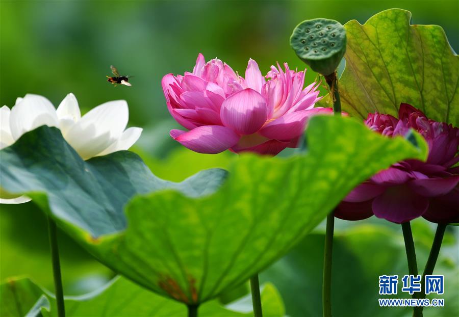 6月21日,在福州茶亭公园荷花塘里,荷花盛开。 当日是夏至节气。在福建省福州市以荷花为主题的古典园林茶亭公园里,荷花绽放,蜜蜂和鸟类飞舞花丛中,宛如炎炎夏日里的一幅写意花鸟画卷。 新华社记者魏培全摄
