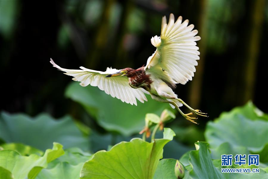 6月21日,一只池鹭从荷花池塘飞过。 当日是夏至节气。在福建省福州市以荷花为主题的古典园林茶亭公园里,荷花绽放,蜜蜂和鸟类飞舞花丛中,宛如炎炎夏日里的一幅写意花鸟画卷。 新华社记者魏培全摄