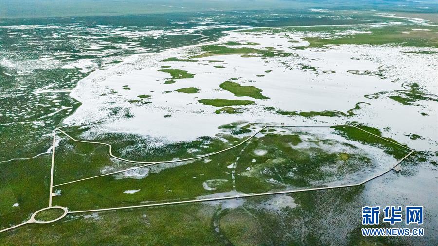 位于四川省阿坝藏族羌族自治州若尔盖县西北部的花湖生态旅游区(6月16日摄,无人机照片)。近年实施的花湖湿地生态修复试点工程将花湖湖泊水位提高了52厘米,湖泊面积由215公顷扩大到650公顷,恢复花湖湿地及周边沼泽892公顷,有力促进项目实施区生态系统功能的修复。