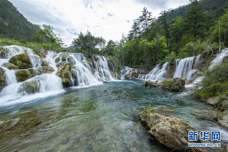 九寨沟风景名胜区内的“双龙海瀑布”(6月18日摄)。该瀑布原先掩藏在密林深处,2017年8月九寨沟地震灾害发生后,水文环境发生变化,此处水流量变大,瀑布更加壮观美丽。新华社记者 沈伯韩 摄