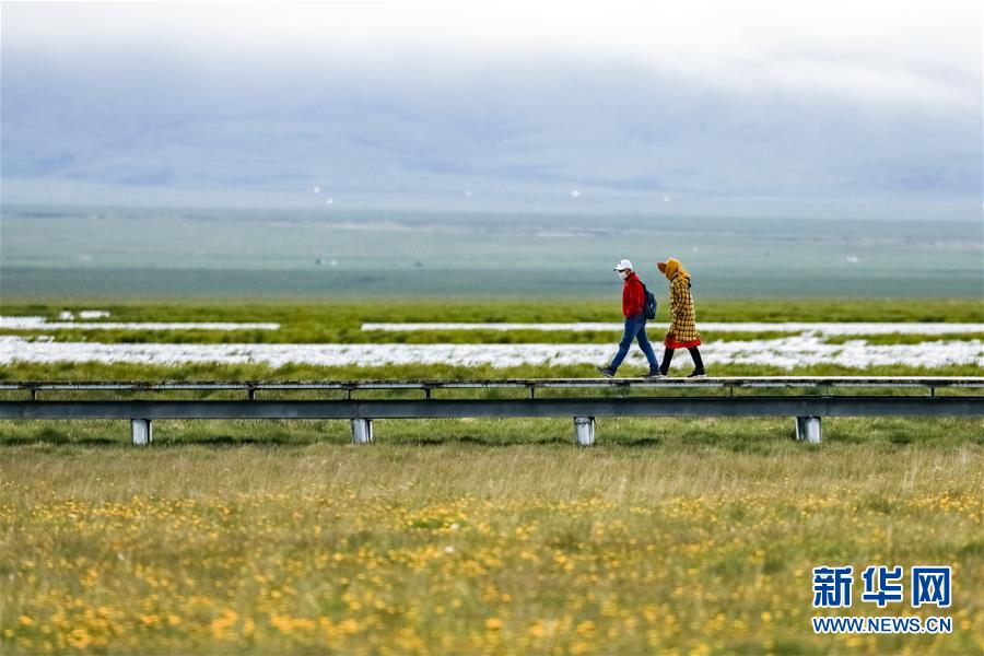 在位于四川省阿坝藏族羌族自治州若尔盖县西北部的花湖生态旅游区,游人走在栈桥上欣赏美景(6月16日摄)。 新华社记者 沈伯韩 摄