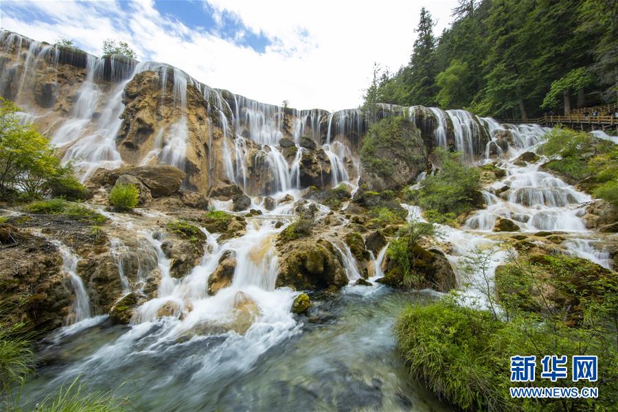 九寨沟风景名胜区内的“珍珠滩瀑布”(6月18日摄)。九寨沟近年来持续推进造林、封山育林、沙化土地治理等多项生态涵养工程,在加快九寨沟世界自然遗产抢救修复和恢复保护的同时,最大程度维护了自然遗产地的原真性和完整性。新华社记者 沈伯韩 摄
