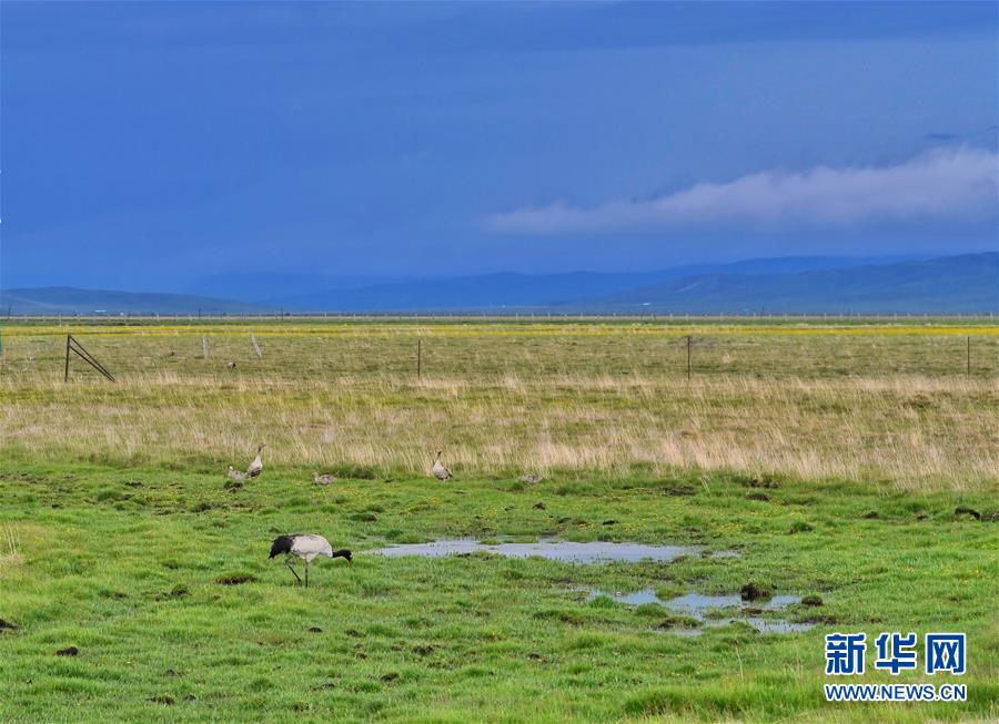 在位于四川省阿坝藏族羌族自治州若尔盖县的花湖生态旅游区,一只黑颈鹤(前)和几只灰雁在觅食(6月16日摄)。近年来,当地实施花湖湿地生态修复试点工程,为野生动物栖息营造了良好的生态环境。濒危物种黑颈鹤数量持续稳定上升,1999年发现黑颈鹤407只,2019年其数量估计约为1000只左右。 新华社记者 刘坤 摄