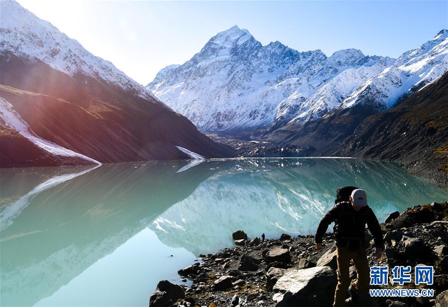 7月13日,一名徒步者走过新西兰库克山国家公园的湖泊。 位于新西兰南岛南阿尔卑斯山脉的库克山国家公园由19座海拔超过3000米的高峰、庞大的塔斯曼冰川和众多冰川消融湖泊组成,其中海拔超过3700米的库克山是新西兰最高峰。 新华社记者 郭磊 摄