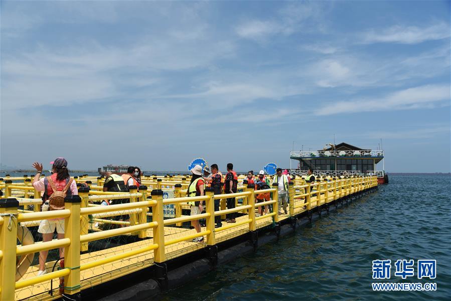 7月17日,游客在荣成桑沟湾泓泰国家级海洋牧场观光体验。 近年来,山东省荣成市重点发展特色海洋旅游产业,打造众多国家级海洋牧场,保留修复传统海草民居,吸引游客前来观光体验。如今特色海洋旅游已逐渐成为荣成经济发展新的增长点。 新华社记者 王凯 摄