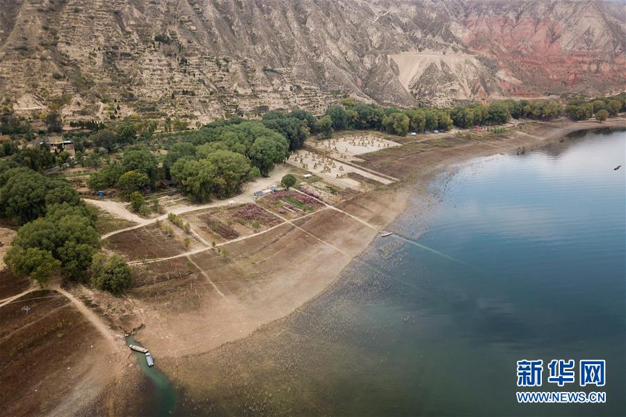 这是10月14日拍摄的刘家峡“黄河三湾”一景(无人机照片)。 在甘肃省永靖县刘家峡水库沿岸,三塬镇的“黄河三湾”——蔚海湾、碧海湾、金海湾山明水秀,秋色宜人,是秋季乡村旅游的好去处。 新华社记者 马希平 摄