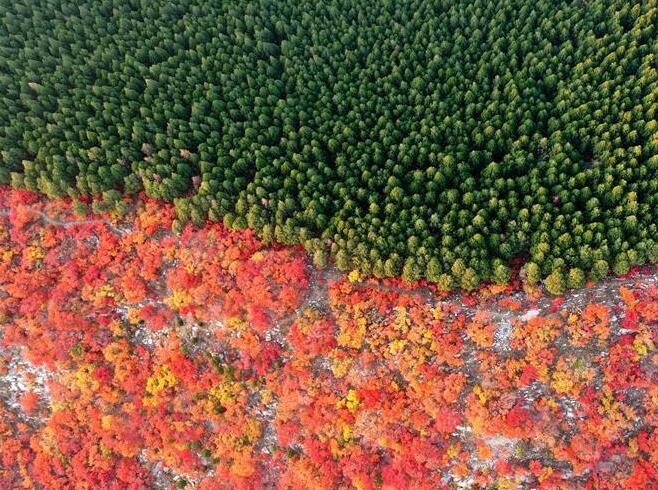 日前,位于山东济南市的蝎子山以山脊为分界线,形成了“一山双色”景观,令人称奇。据了解,蝎子山山体南侧种植着2万多平方米的黄栌树,而在山体的北侧是松树林,所以每到秋冬交替时节,便出现了半边青翠半边红的景象。