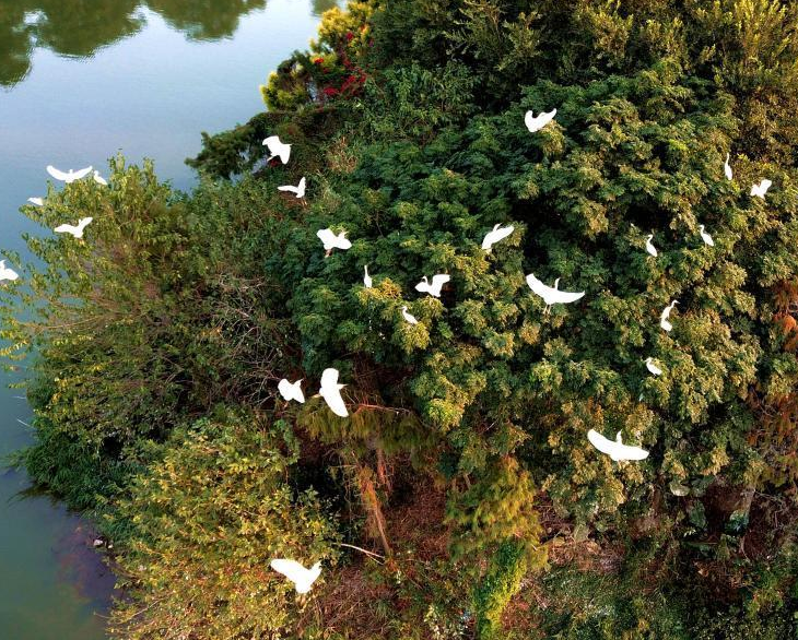 11月13日,福建漳州碧湖白鹭纷飞。近年,随着生态环境的不断好转,碧湖已成为漳州的一张名片,吸引许多市民在此休闲娱乐。