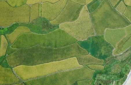 图案是由当地农民在插秧时,采用特殊品种的水稻栽种而成。从空中俯瞰,耕牛的景象栩栩如生。
