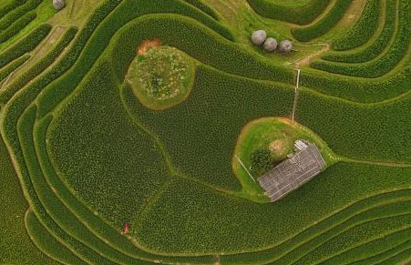 近日,贵州省黔东南苗族侗族自治州榕江县月亮山地区的稻田禾苗返青,层层叠叠的梯田绿意盎然,宛如画卷。