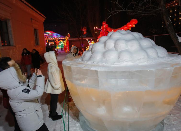 1月9日晚,首届哈尔滨道台府冰雪灯会吸引大批游客前来观赏。灯会以道台府特有的百年风貌和历史故事为内涵,将年节文化中最具代表性的非遗彩灯与哈尔滨的冰雕雪塑艺术无界融合,经典再现了哈尔滨百年前的繁荣场景,为中外游客奉上了一场极致体验的视觉盛宴和新春文化大餐。图为冰雪制成的“大元宵”吸引游客观赏。