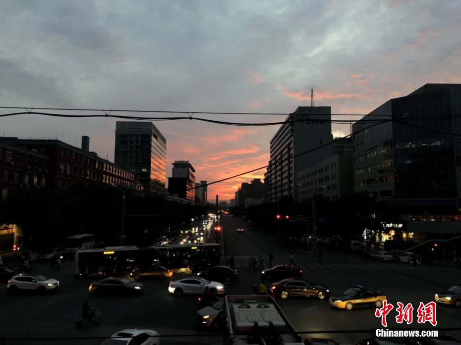 9月18日傍晚,北京天空出现绚丽火烧云吸引路人驻足观赏。中新网记者 王祎 摄